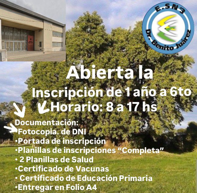 La Escuela de Educación Secundaria N°3 de Benito Juárez mantiene abierta la inscripción para el ciclo lectivo 2026 en todos los años de la escolaridad secundaria.
