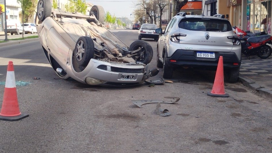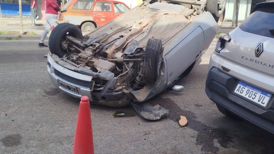 Hace instantes se produjo un accidente de tránsito en la Avenida Libertad, frente al local de electrodomésticos Naldo Lombardi. Un automóvil modelo Ford Ka volcó y quedó sobre la cinta asfáltica.
