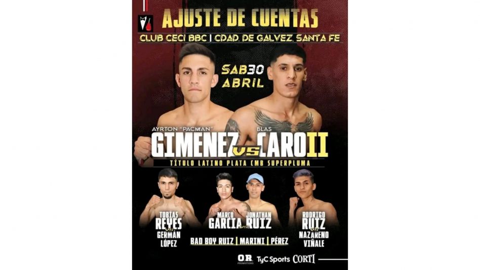 Cabe recordar que en el programa del próximo sábado, el invicto platense Ayrton «Pacman» Giménez (14-0-0-1 SD, 3 KO) y el rosarino por adopción, Blas Caro (8-3-0, 4 KO), reeditarán la batalla que libraron en noviembre pasado. En esta ocasión, estará en juego el título latino plata CMB de categoría superpluma, que defenderá el bonaerense por primera ocasión.