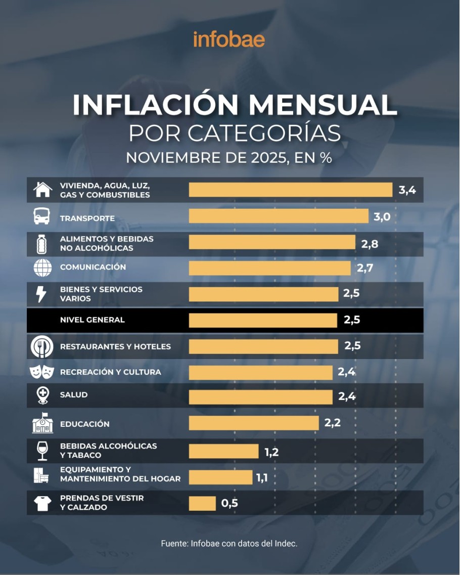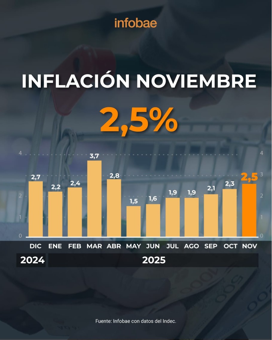 La inflación de noviembre fue de 2,5%, según el Instituto Nacional de Estadística y Censos (Indec), lo que implicó una aceleración de 0,2 puntos porcentuales respecto al mes anterior cuando ascendió a 2,3%. Además, el Índice de Precios al Consumidor (IPC) registró una variación interanual de 31,4% mientras que en lo que va del año acumula 27,9%. En lo que resta y en 2026 habría presiones sobre el indicador por las subas de los precios regulados.