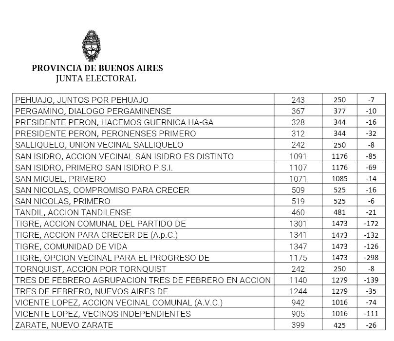 En cuanto a lo local, hay agrupaciones que también tienen mucha incidencia en la vida política, como Nuevo Zárate, el sello del exintendente zarateño, Osvaldo Cáffaro. Pero también aparecen otras de localidades del interior como Nuevo Azul, Bragado con Fe, Acción Marplatense, Juntos por Pehuajó, Compromiso para Crecer de San Nicolás y Diálogo Pergaminense.