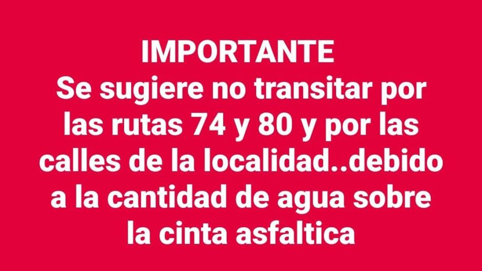 Bomberos Voluntarios de Barker informan que se recomienda no transitar por las rutas 74 y 80, así como evitar circular por las calles de la localidad, debido a la gran cantidad de agua sobre la cinta asfáltica.