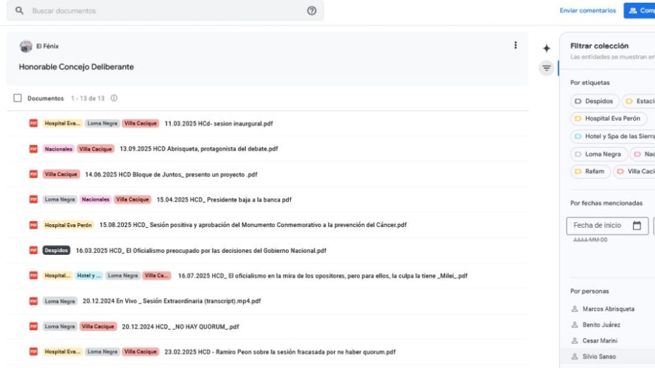 Para esta primera etapa se eligieron sesiones del Honorable Concejo Deliberante que ya habían sido redactadas. Con Pinpoint, se pueden buscar datos dentro de los textos, detectar temas recurrentes y hasta medir quiénes fueron los concejales más activos o los más silenciosos en cada debate.