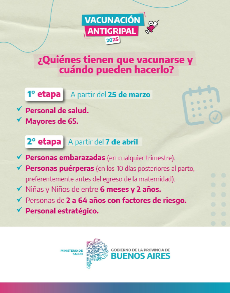 La vacuna antigripal está destinada al personal de salud, mayores de 65 años, niñas y niños de 6 a 24 meses, personas gestantes y puérperas, personas de 2 a 64 años con factores de riesgo y personal estratégico. La inmunización es gratuita en todos los vacunatorios bonaerenses y la aplicación se realiza en forma jerarquizada, de acuerdo a la implicancia de los factores de riesgo de cada grupo.