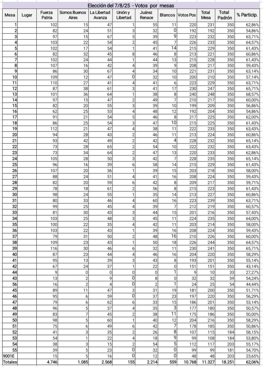 Cada fila muestra el pulso de la jornada: cuántos votos sacó Fuerza Patria, Somos Buenos Aires, La Libertad Avanza, Unión y Libertad y Juárez Renace, además de los blancos, el total de sufragios y el porcentaje de participación.