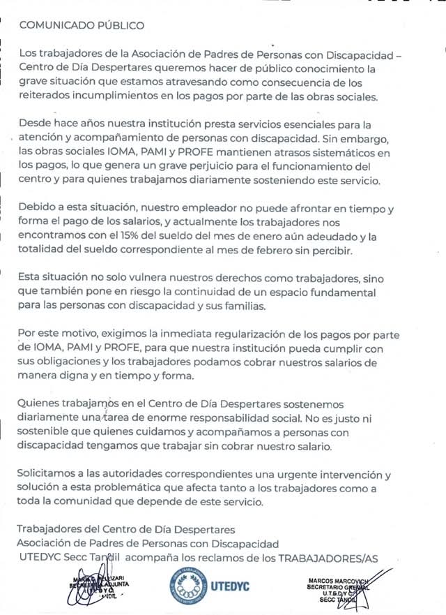 Advierten retrasos sistemáticos en los pagos de IOMA, PAMI y PROFE. Aseguran que se les debe parte de enero y la totalidad de febrero, y alertan por el riesgo en la continuidad del servicio para personas con discapacidad.