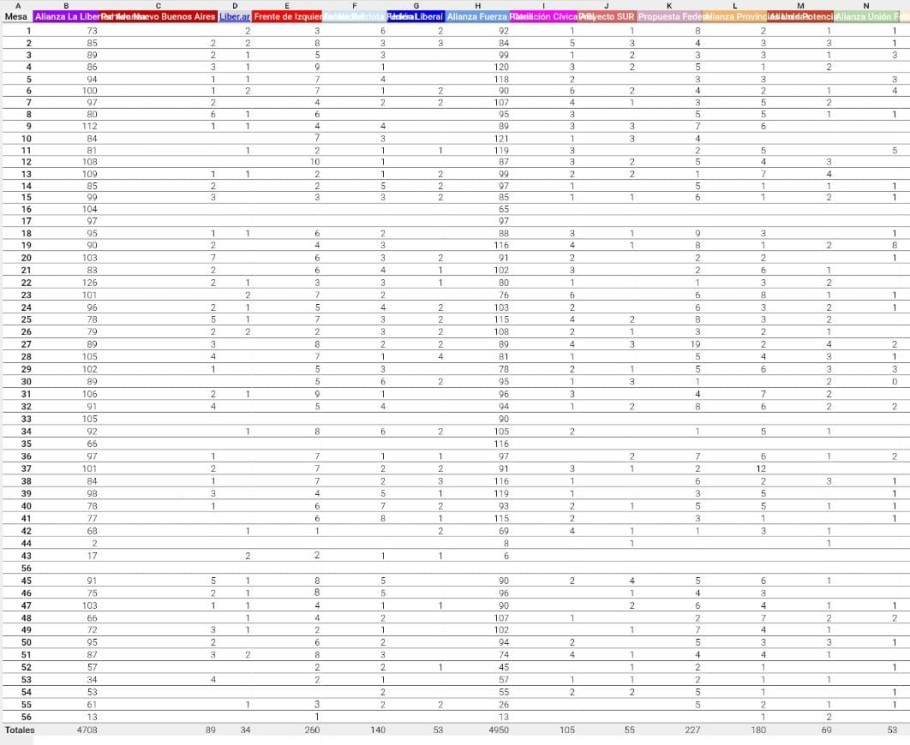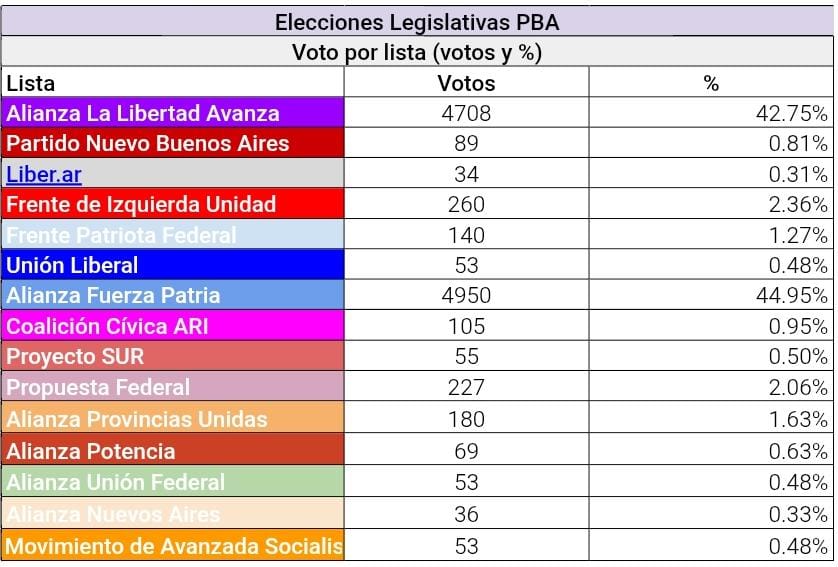 Con las 56 mesas escrutadas, Fuerza Patria obtuvo un total de 4.914 votos (45,22%), superando por un estrecho margen a la alianza La Libertad Avanza, que alcanzó 4.708 votos (43,33%).