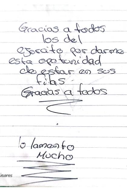En otro fragmento de la carta, Gómez agradeció al Ejército por la oportunidad que tuvo de integrar sus filas. "Gracias a todos. Lo lamento mucho", escribió.