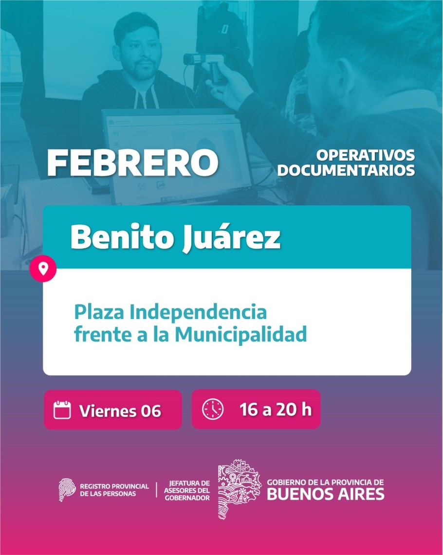 El Operativo Documentación arribará a Benito Juárez y a la localidad de Barker, con el objetivo de facilitar el acceso a trámites registrales para vecinas, vecinos y personas que se encuentren en el distrito.