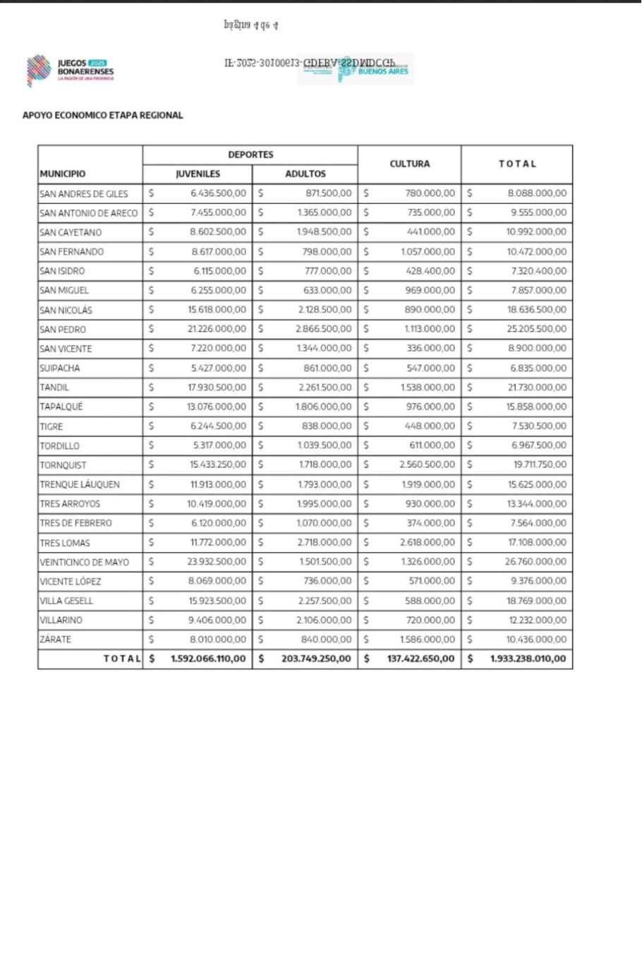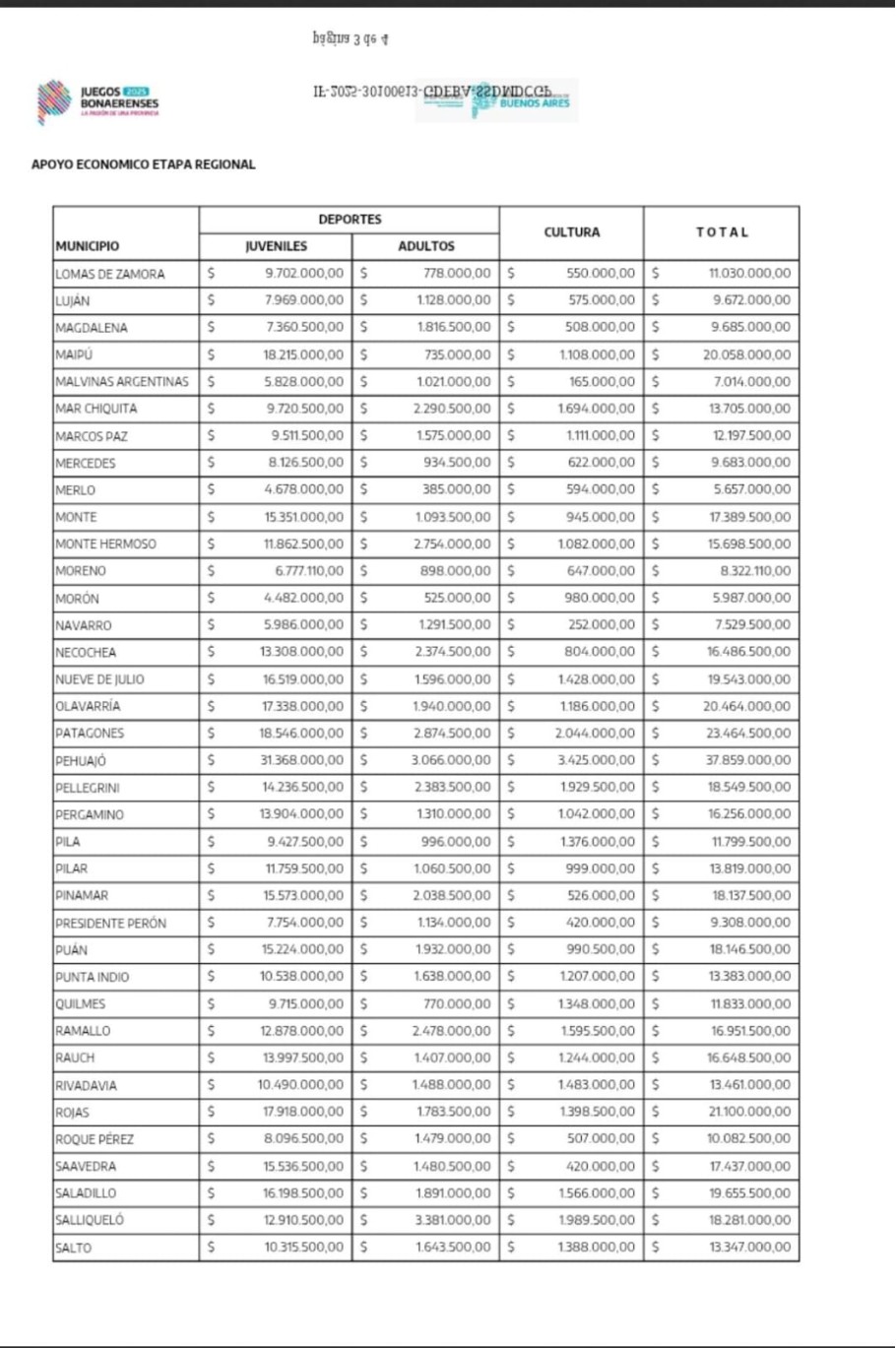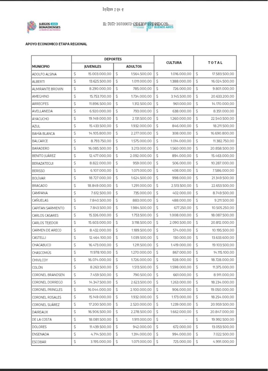 A Benito Juárez le adjudican la suma de $12.477.000,00 para Deportes Juveniles, $2.092.000,00 para deportes en Adultos y $849.000,00 para cultura, un total de $15.466.000,00.