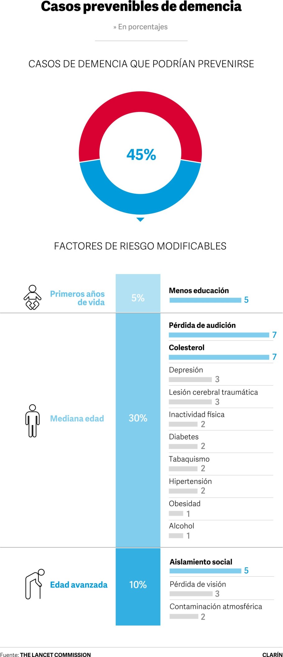 En la mediana edad, es importante prestar atención a los factores de riesgo cardiovascular (obesidad, hipertensión, diabetes, tabaquismo, ingesta de alcohol), destaca Fernández. También tratar la pérdida auditiva (en caso de que la haya) y evitar los traumatismos de cráneo. En cuanto a los factores de riesgo cardiovascular, este año se incluyó al colesterol LDL elevado entre los modificables.