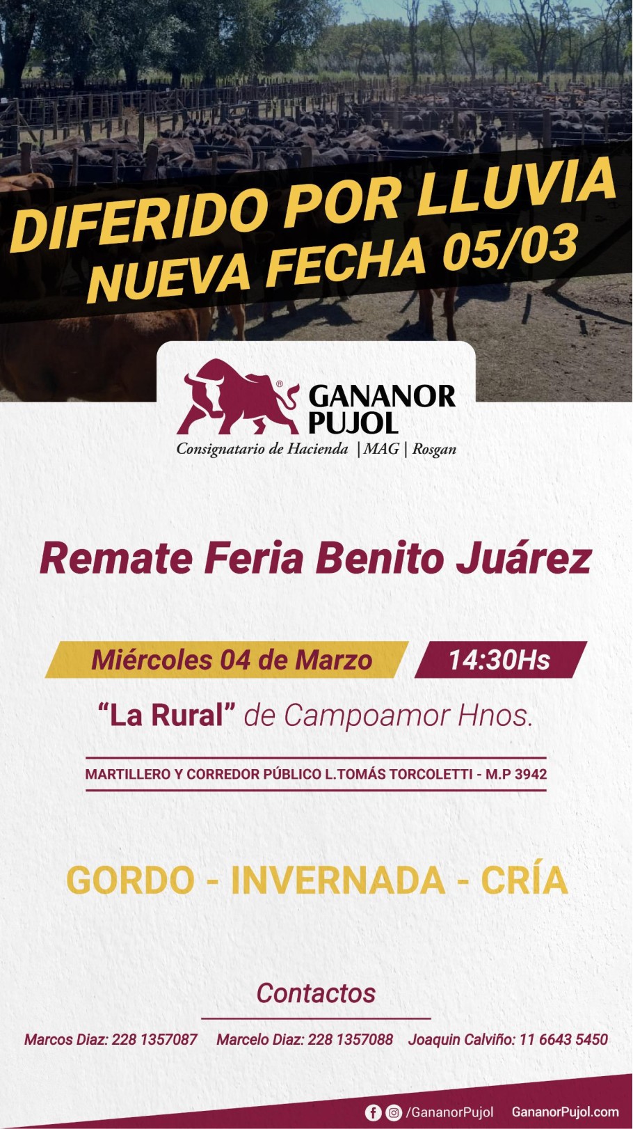De acuerdo a lo informado por sus representantes locales, Marcos y Marcelo Díaz, el remate de la firma Gananor Pujol anunciado para mañana miércoles fue postergado debido a las condiciones climáticas.