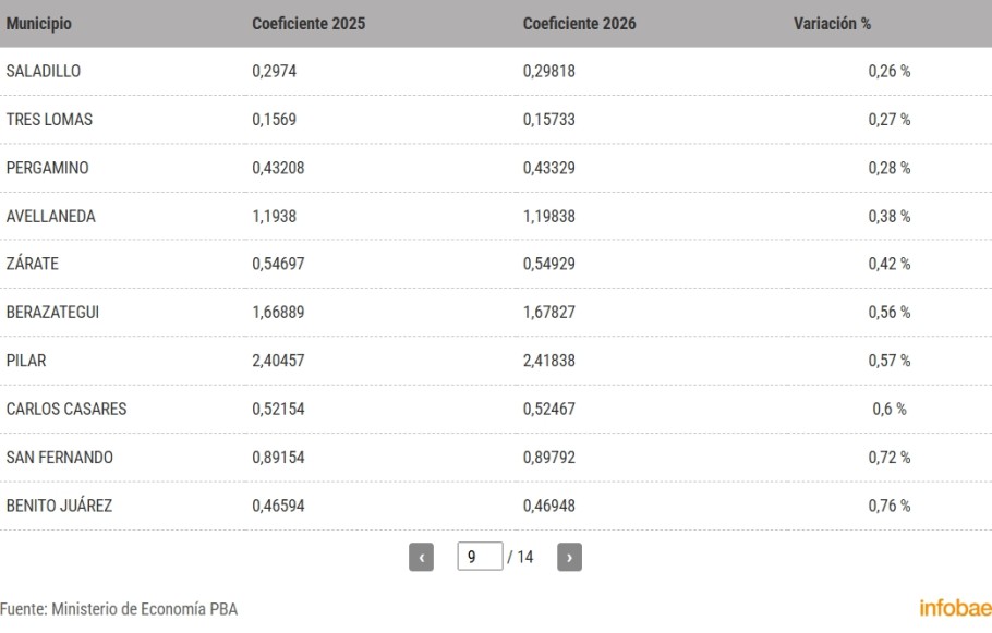 Hay 64 municipios, que ven modificado a favor, el ingreso en 2026. Allí está Juárez con el 0,76% de variación favorable. El coeficiente de 2025 fue de 0,46594 y el de 2026 es de 0,46948.