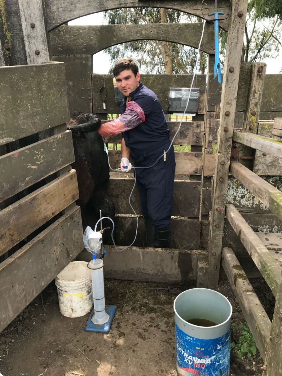 "En promedio se obtiene entre 5 y 6 embriones por colecta o por flushing. Se puede llegar a realizar unas 5 o 6 colectas en el año, con lo cual en promedio se puede llegar a obtener unos 30 embriones en el año por una hembra donante, lo que nos permite lograr después de obtener un 50% 0 60% de preñez que es lo normal podemos llegar a obtener unos 15 o 20 terneros que, en forma natural, por servicio natural, obtendríamos un ternero por vaca por año".