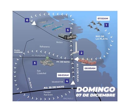 El espectáculo para el público en Buenos Aires se desarrollará en la mañana del 7 de diciembre, entre las 8 y las 8.45, cuando la escuadrilla llegue desde el noroeste, procedente de Río Cuarto, e ingrese al área metropolitana por el Río de la Plata.
