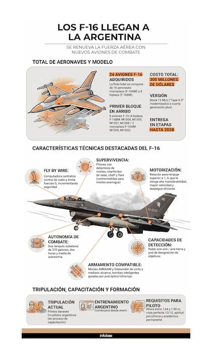 Actualmente, los F-16 son operados por pilotos daneses, mientras que en las cabinas traseras viajan pilotos argentinos, quienes recibirán capacitación en cuanto las aeronaves lleguen al país.